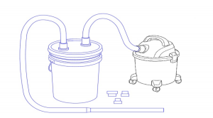The vacuum consists of a 5-gallon high-density polyethylene (HDPE) bucket with a modified snap-seal lid incorporating two sealed hose ports: